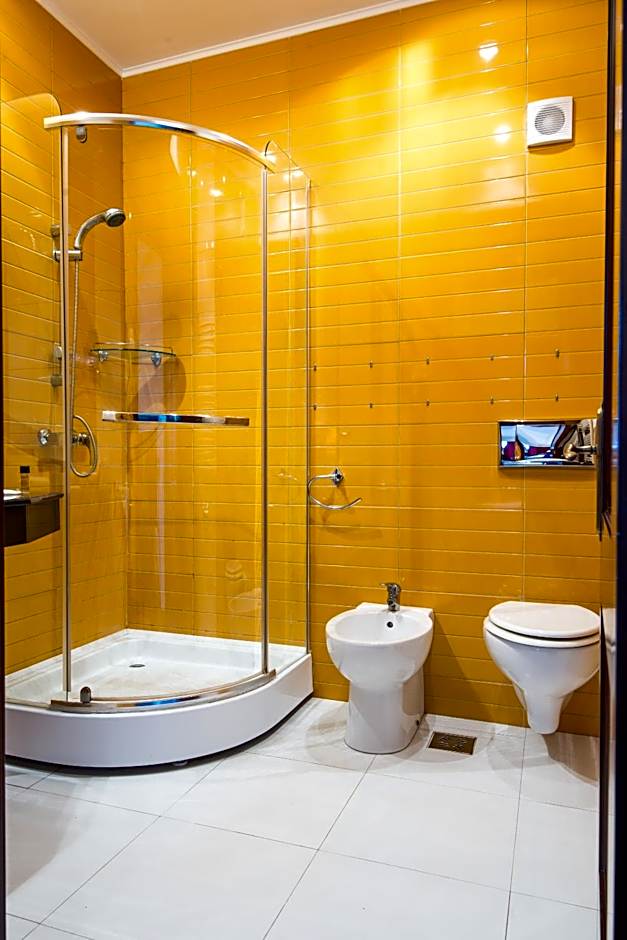 Spacious suite featuring a separate living room with a flat-screen TV, and a private bathroom with shower cabin.